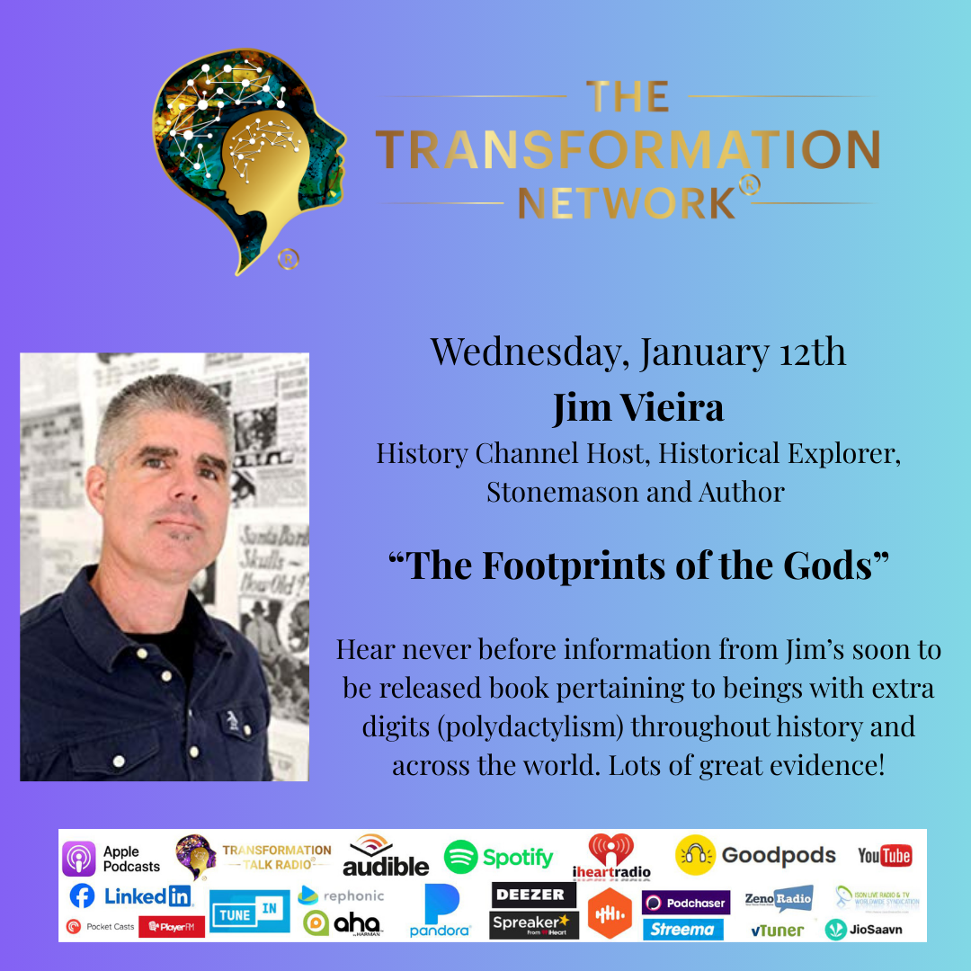 History Channel Star Jim Vieira will discuss his newest book, soon to be released publicly. He unravels one of the oldest cold cases in history- the enigma of extra digits. The subject of his new book “The Footprints of The Gods”, (polydactylism) or extra digits has been recorded worldwide in rock art and artifact iconography and associated with Gods, Giants, the supernatural and the divine throughout all of recorded history. From over 10,000 year old cave paintings to the oldest settlements on earth, learn the strange truth about our past from ancient texts, worldwide traditions and academic documentation.